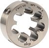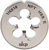 Круглая дюймовая плашка NKP предназначена для нарезания и калибровки правой американской конической резьбы на прутках, винтах, шпильках и наружных поверхностях деталей из цветных металлов, чугуна, алюминия, меди, бронзы, цинка, пластика, легированной и нержавеющей стали твердостью до 1000 Н/мм². Представляет собой круглую гайку с резьбой, прорезанной сквозными осевыми стружечными канавками, которые образуют режущие грани. Имеет правое направление резьбы и отверстия со стружколомом для выведения стружки. Формирует резьбу с углом 60° и конусностью 1:16.