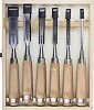 Лезвия изготовлены из хромованадиевой стали (CrV), легирование хромом и ванадием значительно повышает твердость, износостойкость и упругость стали. Это критически важно для инструмента, по которому бьют киянкой. Инструмент не будет крошиться от ударов, при этом его можно достаточно легко заточить.